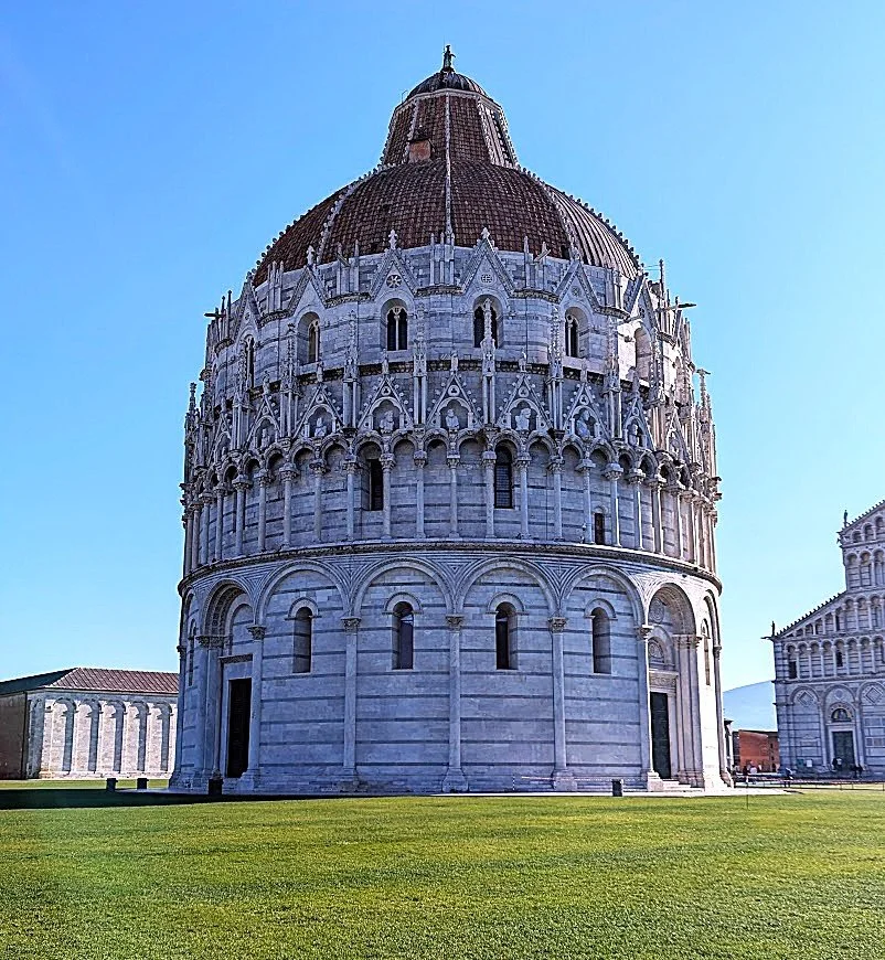 The Bapistry- In the late Middel Ages, a building adjacent to a cathedral known as a bapistry was built as a symbol of Pisa’s economic and religious power. The purpose was to establish a separate space to administer the sacrament of baptism to new members of the church. While some baptisms were mass events where large groups would be baptized at once on important theological days, it was also used for the baptism of individuals. The Bapistry building at Pisa is an impressive circular building with a domed roof, arches on the lower portion, and columns around the middle of the structure. The main portal was adorned with reliefs showing scenes from the life of John the Baptist. Inside the structure is a hexagonal baptismal font and a pulpit made of fine marble. The interior is renowned for its acoustic qualities as well.