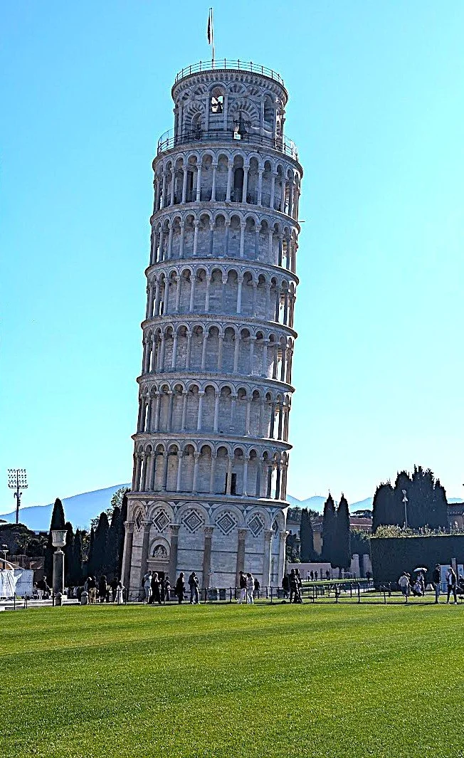 The Leaning Tower – The Leaning Tower is a bell tower that is cylindrical in shape. The north side of the Tower rises 179 feet to the north side and 177 feet from the south side. There are three parts to the Tower. There is a firm marble base with columns all around it, then six levels of blind arches stacked up like layers on a cake, and finally a bell tower with seven bells hanging in different columns. Construction on the Tower by architect Bonanno started in 1173 and as soon as the first three floors were completed, the south side of the Tower began sinking because of the soft soil. Construction ceased for almost one hundred years before being resumed a century later. Completed in 1350, visitors came by to see the Tower for centuries and often climbed its 290 steps to the top on a cylindrical staircase to enjoy a panoramic view of the city. The Tower attracted Galileo in the 16th century to conduct his gravity experiments there. The proximity of Pisa to Florence and Rome made it a popular stop for pilgrims or wealthy Europeans taking a Grand Tour of the sites in Italy.