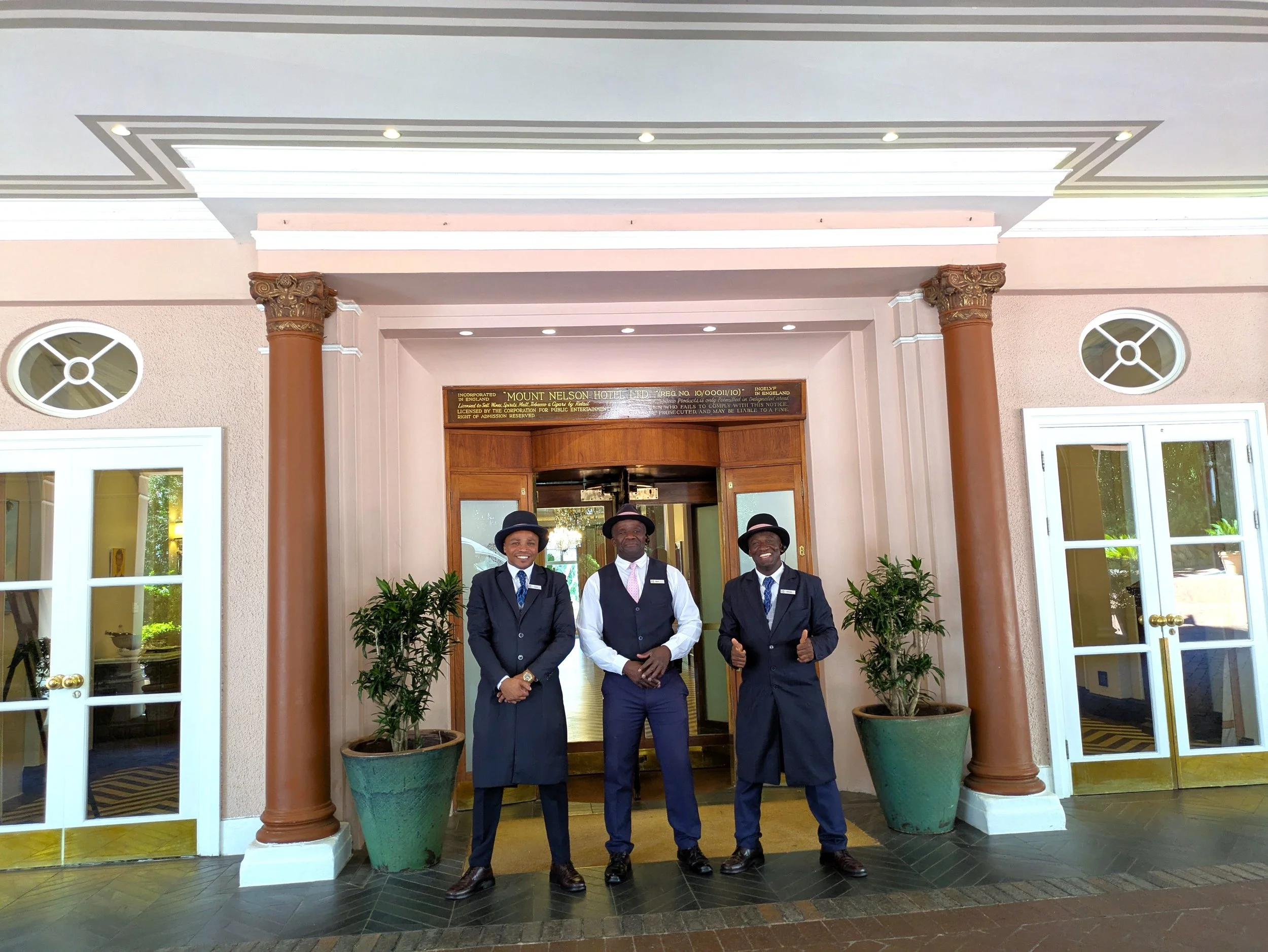 The hotel recently celebrated its 125th anniversary. The background and history of the establishment is described on the hotel’s website and in its publication “The Nellie Times.” Built in 1899 by Sir Donald Currie, a shipping company executive, the Mount Nelson was developed to provide Cape Town with a “stylish and elegant” hotel that would rival the leading hotels of London. To make the Mount Nelson a centerpiece for city business and social activity, Currie selected a prime location with a mountain view, fountains, vineyards, and shade trees that had previously been used as a garden. Success followed during the 20th century as dignitaries including Winston Churchill, Bobby Kennedy, and the Dalai Lama, along with celebrities such as John Lennon and Sir Arthur Cannon Doyle, stayed at the hotel. One unique feature, the classic entrance gate and white columns of the hotel was built to commemorate a visit by the Prince of Wales in 1925. Vehicles and people arriving at the front gate pass through security and are welcomed by finely attired doormen. Fortunately, the hotel’s roots in the imperial age did not prevent its operators from redesigning and upgrading the hotel’s facilities to meet the needs of 21st century guests.