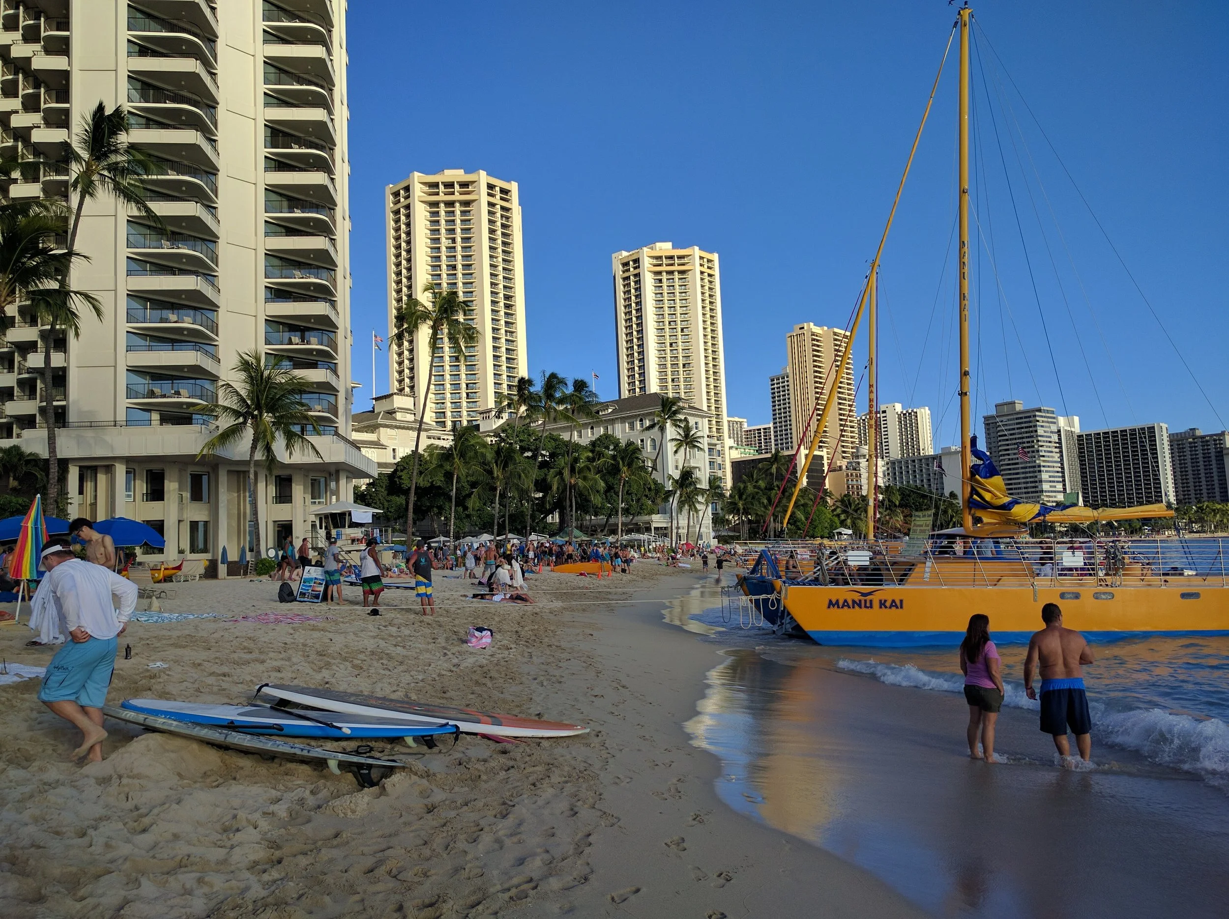 Waikiki Beach- The Waikiki Beach area was separated from the main city of Honolulu in the early 1900s and it consisted then of little more than a few guest houses. Much has changed as several traditional hotels such as the pink Royal Hawaiian Hotel and dozens of international hoteliers now offer close to 30,000 hotel rooms and many condo units to residents and tourists along the beach. Waikiki Beach is narrow, but the soft sand, warm water, gentle surf and gorgeous sunsets preserve the fabled ambience of the location. Crowded at times, one must keep an eye out when swimming at Waikiki Beach for catamarans and Hawaiian canoes going back and forth from the shore to the surf.